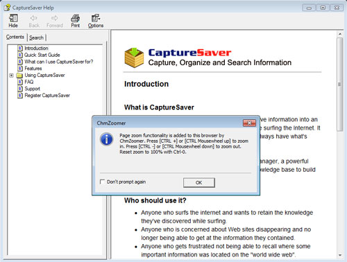 Với Microsoft Internet Explorer 7/8 bạn có thể biến các trang web trở nên dễ đọc hơn bằng cách phóng to trang web (thu nhỏ). Tuy nhiên, chức năng zoom không thể hoạt động trên các ứng dụng dựa trên trình duyệt khác. ChmZoomer cung cấp cho bạn chức năng zoom toàn trang ở tất cả các ứng dụng dựa vào trình duyệt khác, ví như các file Chm, sách điện tử, RSS Reader,…. Tất cả đều giống như trong IE 7/8. Các phím shortcut cũng giống như IE và Firefox. Nhấn [CTRL +] hoặc [CTRL cuộn chuột lên] để phóng to. Nhấn [CTRL -] hoặc [CTRL cuộn chuột xuống] để thu nhỏ.