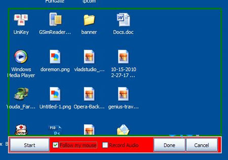 - Screen Record: Để thay đổi kích thước khung hình khi quay, bạn đưa chuột đến đường biên màu xanh, nhấn giữ và rê chuột để kéo giãn khung hình theo kích thước mong muốn. Bạn đánh dấu tùy chọn Follow my mouse nếu muốn ghi hình cả sự di chuyển của con trỏ chuột, đánh dấu tùy chọn Record Audio nếu muốn ghi âm trong lúc quay phim màn hình. Chuẩn bị xong, bạn nhấn Start để bắt đầu. Xong, nhấn Stop để ngừng quay, rồi nhấn Done để tải file lên.