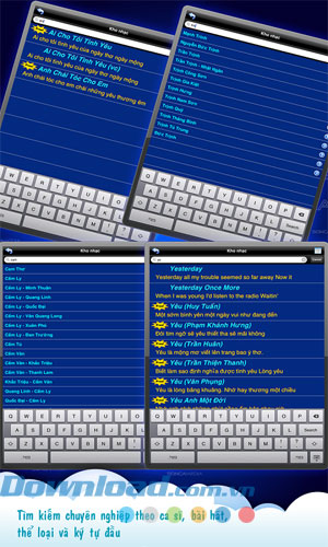 Bạn có thể tìm kiếm bài hát theo chữ cái đầu, theo tên tác giả, ca sĩ, theo tên đầy đủ của bài hát hoặc theo từng thể loại.