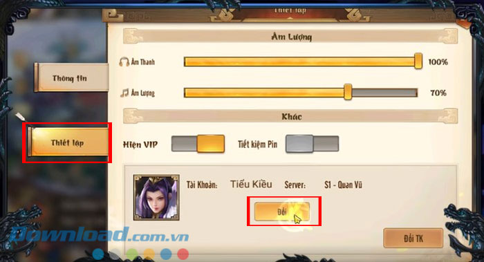 Bước 2: Nhấn vào tab Thiết lập và chọn Đổi.
