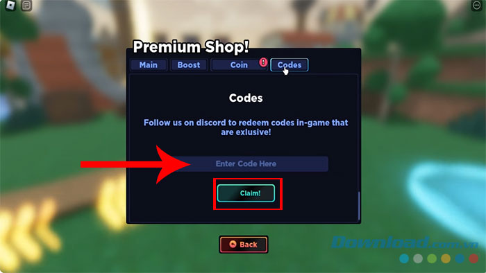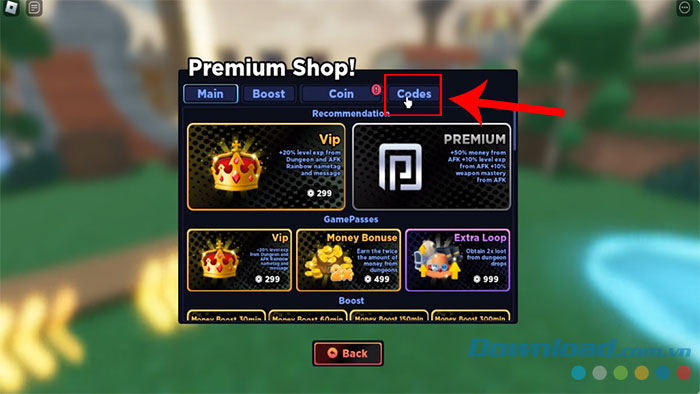 Bước 2: Truy cập tab Codes trong cửa sổ Premium Shop.