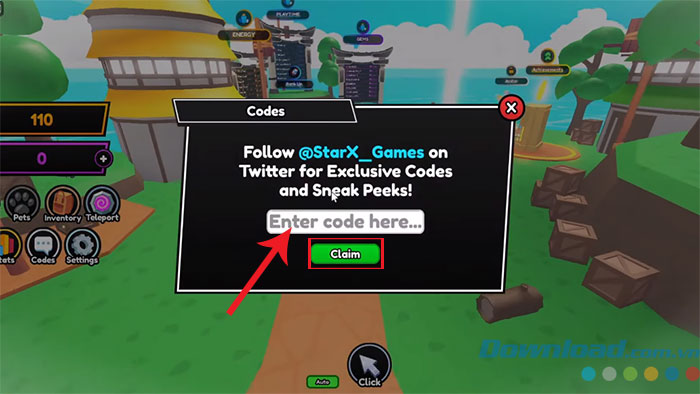 Bước 2: Nhập chính xác hoặc sao chép mã code được cung cấp ở trên rồi dán vào ô trống Enter code here. Sau đó nhấn nút Claim để tiến hành dùng code và thu thập phần thưởng tương ứng.