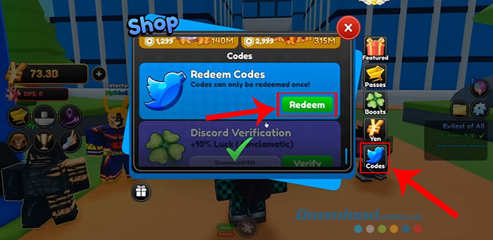 Bước 2: Lướt xuống dưới để tìm mục Redeem Codes hoặc nhấn vào tab có biểu tượng Twitter ở phía bên phải cửa sổ và nhấn vào nút Redeem màu xanh lá cây.
