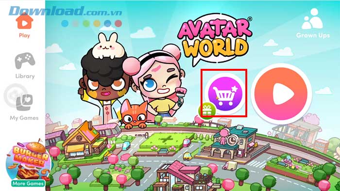 Bước 1: Mở ứng dụng trò chơi Avatar World và bấm vào biểu tượng giỏ hàng màu tím.