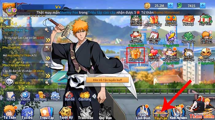 Bước 1: Mở Bleach Huyết Chiến trên thiết bị và truy cập vào Thị trấn, sau đó chọn Nhập code ở phía trên bên phải của giao diện chính.