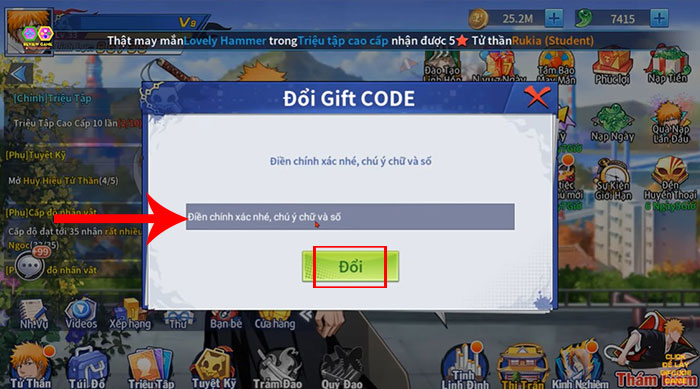 Bước 2: Nhập chính xác hoặc sao chép mã code được cung cấp phía trên và dán vào ô trống. Sau đó nhấn nút Đổi để xác nhận dùng code và nhận phần thưởng trực tiếp trong trò chơi.