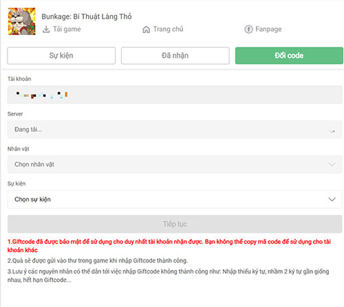Bước 3: Lựa chọn server và nhân vật Bunkage: Bí Thuật Làng Thỏ đang chơi, muốn nhập code đổi thưởng. Sau đó, nhập chính xác hoặc sao chép mã code được cung cấp phía trên vào ô trống.