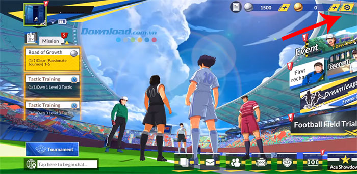 Bước 1: Khởi chạy ứng dụng trò chơi Captain Tsubasa: Ace trên thiết bị của mình và nhấn vào biểu tượng bánh răng cài đặt ở góc trên cùng bên phải.