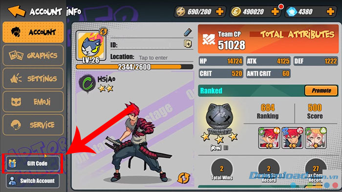 Bước 2: Nhấn vào Gift Code trong cửa sổ Account Info.