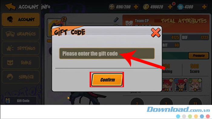 Bước 3: Nhập chính xác hoặc sao chép và dán mã code được cung cấp phía trên vào ô trống. Cuối cùng, nhấn nút Confirm để xác nhận dùng code và nhận thưởng ngay lập tức trong trò chơi.