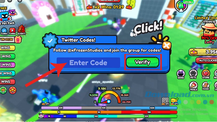 Bước 2: Trong cửa sổ Twitter Codes vừa mở, nhập chính xác hoặc sao chép mã code được cung cấp ở trên rồi dán vào ô trống Enter Code. Cuối cùng, nhấn nút Verity để sử dụng code và nhận phần thưởng ngay lập tức.