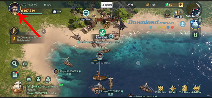Bước 1: Mở Chinh Phục Đại Dương và nhấn vào biểu tượng avatar nhân vật ở góc trên cùng bên trái giao diện chính.
