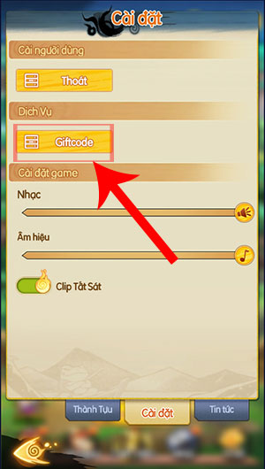 Bước 2: Nhấn vào Cài đặt và chọn Giftcode.
