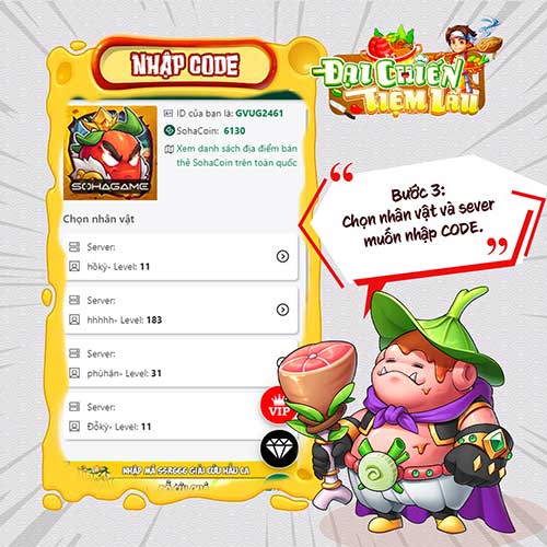 Bước 3: Chọn server và nhân vật Đại Chiến Tiệm Lẩu đang chơi.