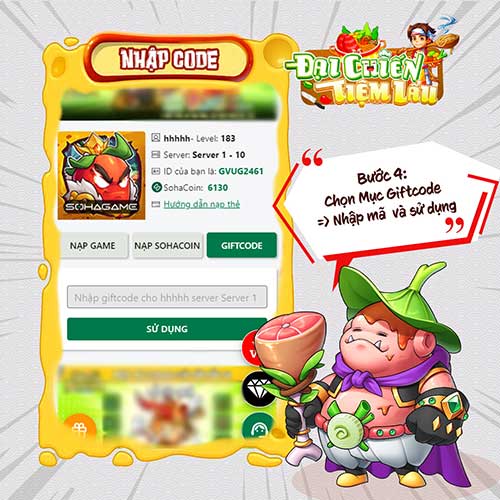 Đại Chiến Tiệm Lẩu yêu cầu người chơi sử dụng code tại trang nhập code của SohaGame. Thao tác nhập giftcode Đại Chiến Tiệm Lẩu quy đổi phần thưởng rất đơn giản với các bước được thực hiện như sau: