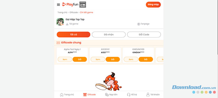 Bước 1: Truy cập trang web https://playfun.vn/giftcode/dai-hiep-tap-tap và đăng nhập vào tài khoản Playfun.