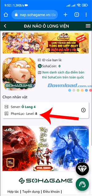 Bước 3: Chọn server và nhân vật Đại Náo Ô Long Viện của mình.