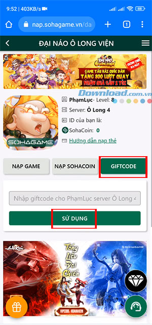 Bước 4: Truy cập tab Giftcode, nhập chính xác mã code vào ô trống và nhấn nút Sử dụng.