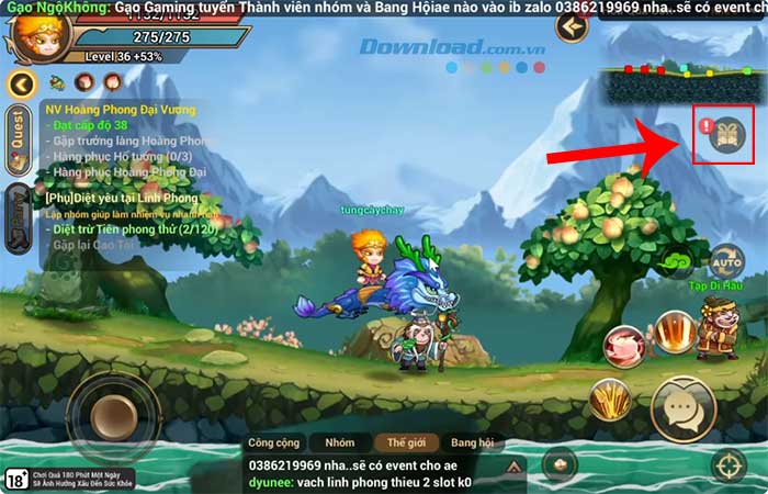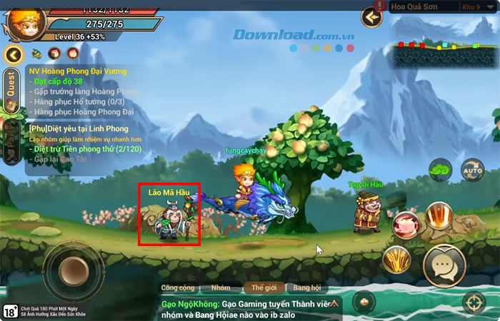 Bước 1: Mở ứng dụng trò chơi Đại Tây Du G4M trên thiết bị và điều hướng tới bản đồ Hoa Quả Sơn. Sau đó, tìm kiếm và tương tác với NPC có tên Lão Mã Hầu.