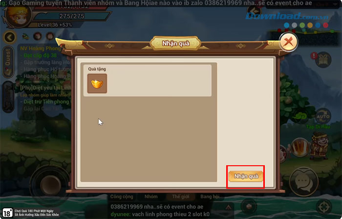 Bước 5: Nhấn nút Nhận quà để thu thập phần thưởng.