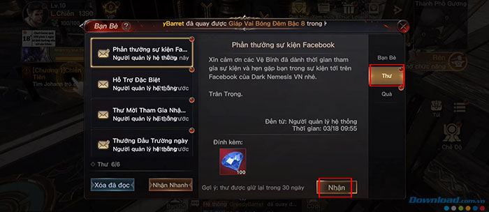 Bước 7: Nhấn vào tab Thư và ấn nút Nhận để thu thập phần thưởng.