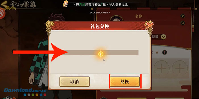 Bước 3: Nhập chính xác hoặc sao chép và dán mã code được cung cấp phía trên vào ô trống. Cuối cùng, nhấn nút xác nhận như hình dưới để xác nhận dùng code và nhận thưởng ngay lập tức trong trò chơi.