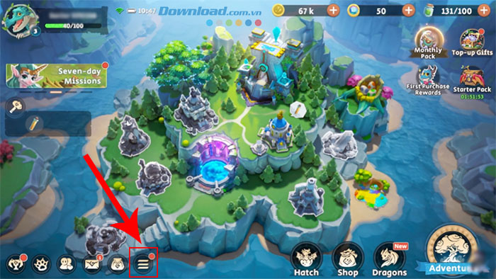 Bước 1: Mở Dragon Arise trên thiết bị và nhấn vào biểu tượng ba dấu gạch ngang ở góc dưới bên trái giao diện.