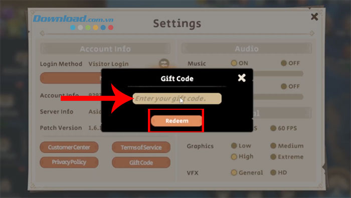 Bước 4: Nhập chính xác hoặc sao chép mã code được cung cấp phía trên vào ô trống, nhấn nút Redeem để xác nhận dùng code và nhận thưởng ngay lập tức trong trò chơi.