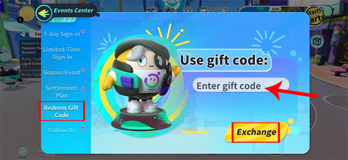 Bước 2: Trong cửa sổ Events Center, mở tab Redeem Gift Code. Nhập chính xác hoặc sao chép mã code được cung cấp phía trên vào ô trống và nhấn nút Exchange.
