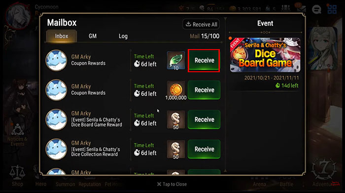 Bước 5: Quay trở lại giao diện chính, chọn biểu tượng thư và nhấn nút Receive để nhận các phần quà.