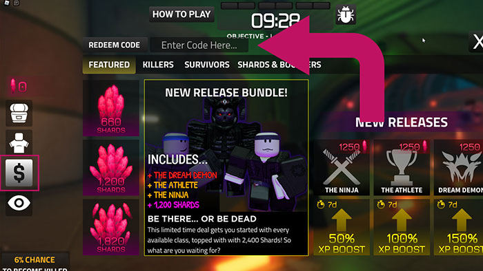 Bước 3: Khi ở trong cửa hàng, hãy nhìn lên đầu màn hình để tìm hộp văn bản có nội dung Enter Code Here. Nhập chính xác hoặc sao chép mã code được cung cấp ở phía trên vào ô trống đó.