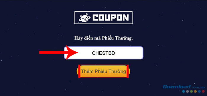 Bước 2: Nhập chính xác hoặc sao chép mã code được cung cấp trong danh sách ở trên vào ô trống (dưới mục Hãy điền mã Phiếu thưởng) và nhấn nút Thêm phiếu thưởng.