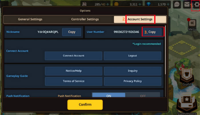 Bước 2: Nhấn vào bánh răng cài đặt. Sau đó mở tab Account Settings và sau chép User Number của mình.