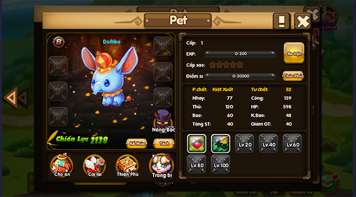 Cũng giống như trang bị, game thủ cũng cần nâng cấp pet để cải thiện thuộc tính cho pet. Pet sẽ có tổng 5 sao, yêu cầu sử dụng Tinh Hoa Pet để nâng cấp sao, từ đó tăng chỉ số sức mạnh, kỹ năng chủ động và kỹ năng thường của pet. Khi nâng cấp đủ 5 sao cho 1 pet, người chơi có thể tiếp tục nâng pet lên bậc mới như S lên SS, SS lên SSS,...