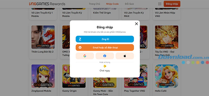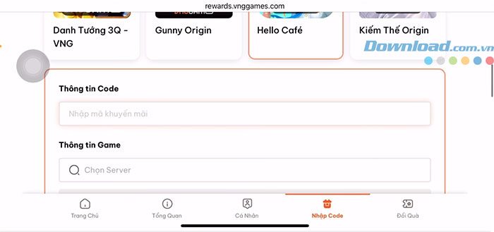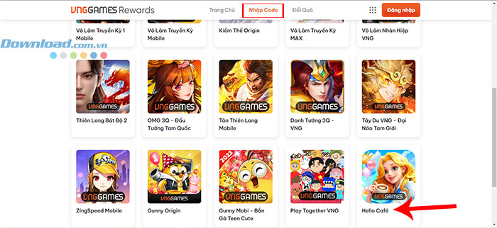 Bước 1: Truy cập trang https://rewards.vnggames.com/redeem và chọn trò chơi Hello Café.