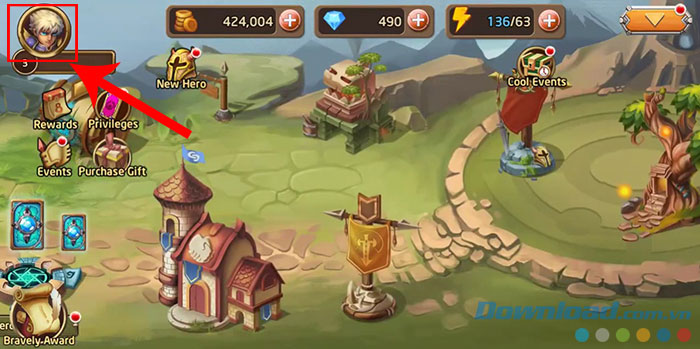 Bước 1: Mở Heroes Legend trên thiết bị của mình và nhấn vào biểu tượng avatar nhân vật ở góc trên cùng bên trái.