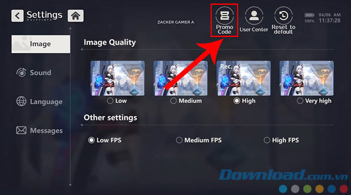 Bước 2: Nhấn vào nút Promo Code trong cửa sổ Settings.