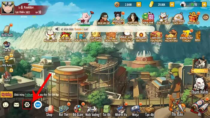 Bước 1: Mở Hỏa Chí Shinobi và nhấn vào biểu tượng bánh răng cài đặt ở góc dưới bên trái giao diện chính của trò chơi.