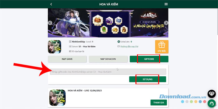 Bước 3: Nhấn vào tab Giftcode, nhập chính xác hoặc sao chép mã code được cung cấp phía trên vào ô trống và nhấn nút Sử dụng.