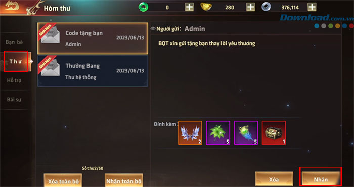 Bước 4: Quay trở lại Hoa Và Kiếm, mở hòm thư trong trò chơi để thu thập phần thưởng.