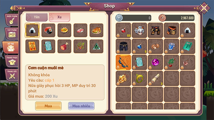 Tại cửa hàng có bán nhiều loại đồ ăn khác nhau và có thể mua được bằng đồng Yên và đồng Xu, đồ ăn càng cao cấp thì hiệu suất hồi phục chúng mang lại càng lớn. Tuy nhiên nhân vật phải đạt đủ level mà mỗi món ăn yêu cầu thì mới dùng được.