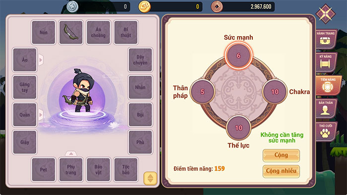 Tiềm năng trong Học Viện Ninja G4M gồm 4 nhánh: Sức mạnh, Thể lực, Chakra, Thân pháp. Ở giai đoạn đầu game người chơi nên ưu tiên cộng điểm tiềm năng vào nhánh Sức mạnh và nhánh Thể lực với class cận chiến, tăng Chakra và Thể lực cho class xa chiến để tăng khả năng farm quái lên cấp.