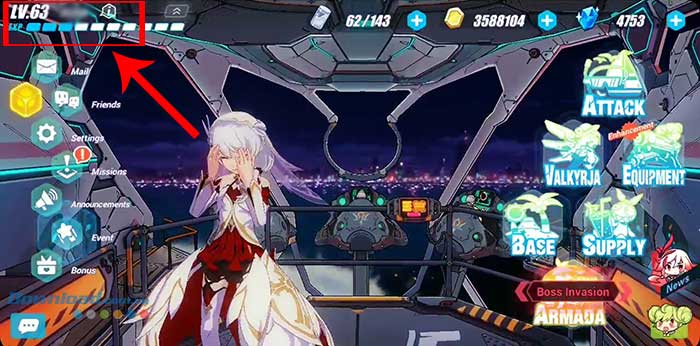 Bước 2: Nhấn vào khu vực thông tin người chơi (hiển thị level hiện tại) ở góc trên cùng bên phải của giao diện chính Honkai Impact.