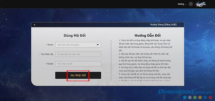Bước 2: Sau khi đăng nhập, chọn Server và Tên nhân vật. Sau đó nhập chính xác hoặc sao chép mã code được cung cấp phía trên vào ô trống của mục Mã Đổi.