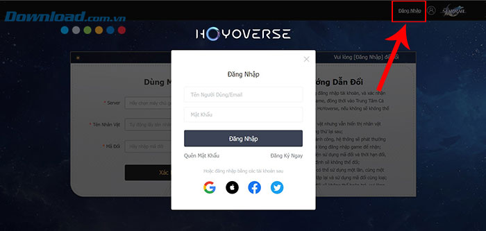 Bước 1: Truy cập trang web đổi code của Honkai Star Rail và nhấn vào Đăng nhập ở góc trên cùng bên phải để vào tài khoản game mà mọi người muốn dùng code.
