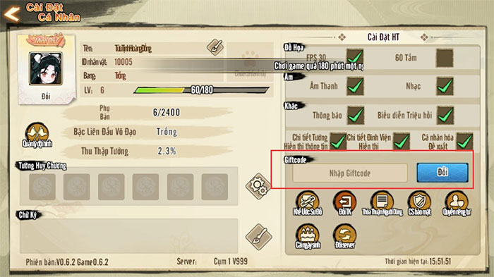 Bước 3: Nhập chính xác hoặc sao chép mã code được cung cấp ở phía trên vào ô trống Nhập Giftcode và nhấn nút Đổi để thu thập phần thưởng ngay lập tức.