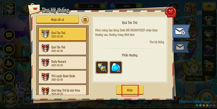 Bước 5: Quay trở lại giao diện chính, mở hộp thư trong trò chơi và nhấn nút Nhận để thu thập phần thưởng.
