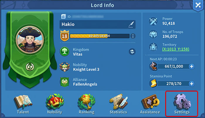 Bước 2: Chạm vào hình đại diện người chơi (menu Lord Info) ở góc trên cùng bên trái của giao diện trò chơi.