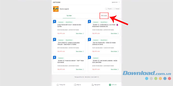 Bước 1: Truy cập https://gc.kamelegend.vn/ và đăng nhập tài khoản chơi game, sau đó chọn tab Đổi code.