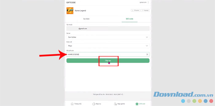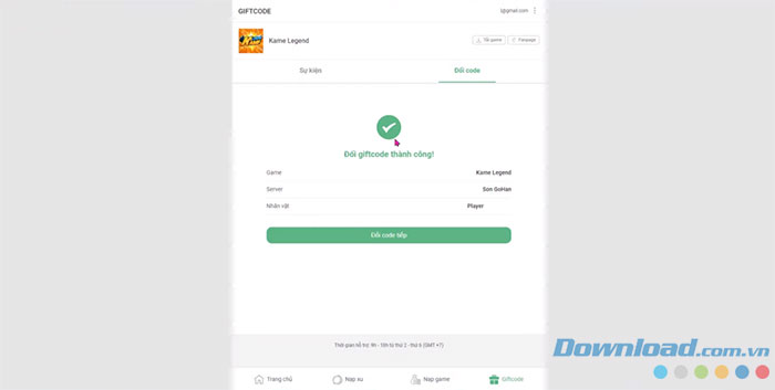 Lưu ý: Tài khoản đang đăng nhập để đổi code phải là tài khoản chơi game Kame Legend thì việc đổi code mới được áp dụng.